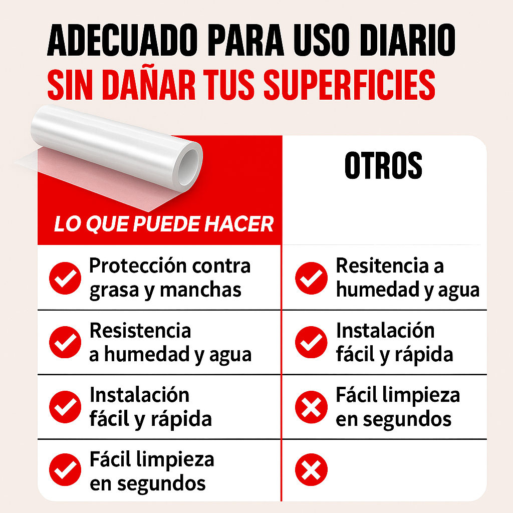 Es transparente, resistente y no deja residuos al quitarlo. Ideal para quien cuida su cocina.