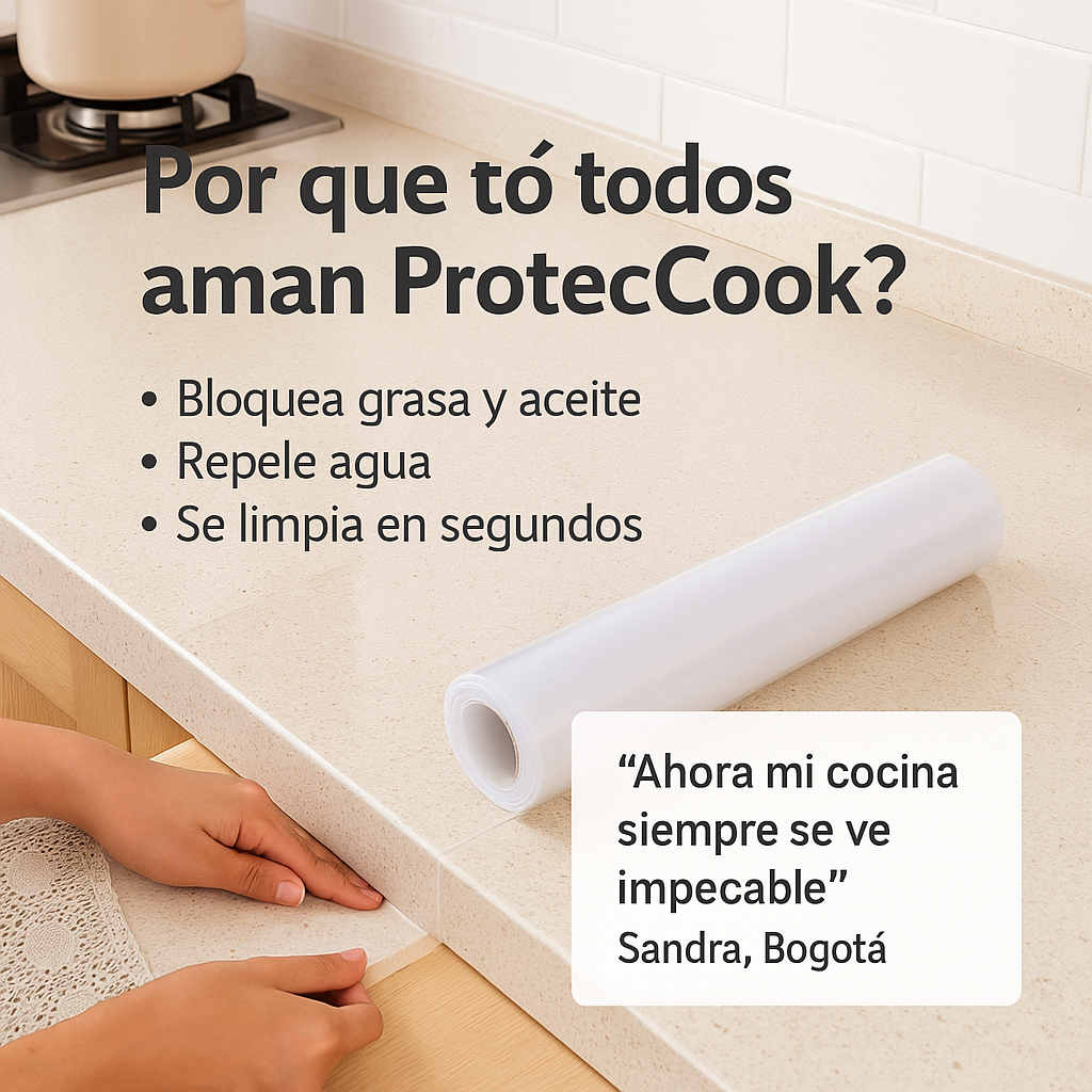Desde que puse ProtecCook en mi mesón, limpiarlo es cuestión de segundos. ¡Un cambio total en mi cocina!